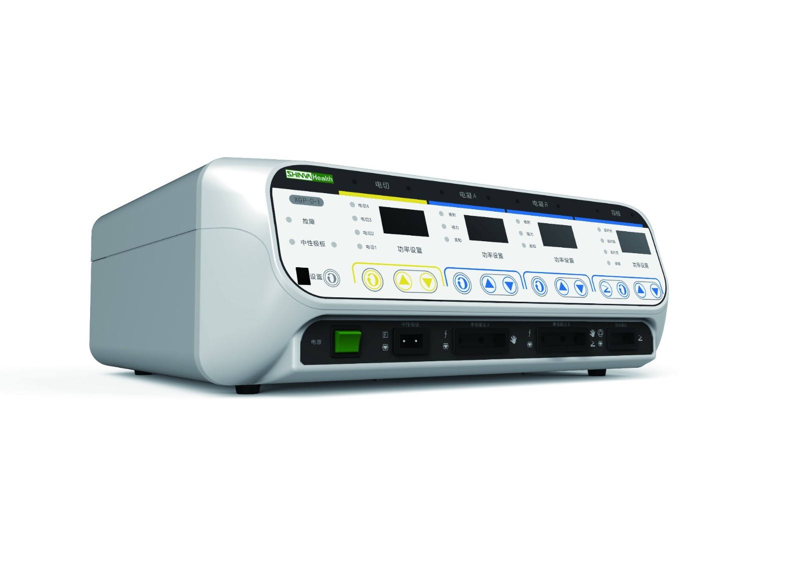 XGP-D-I型 1. 3种电切、3种电凝模式可选 2. 输出功率自动调节 3. 负极板安全实时监控 4. 双极自动电凝控制 5. 2路单极、1路双极3路输出