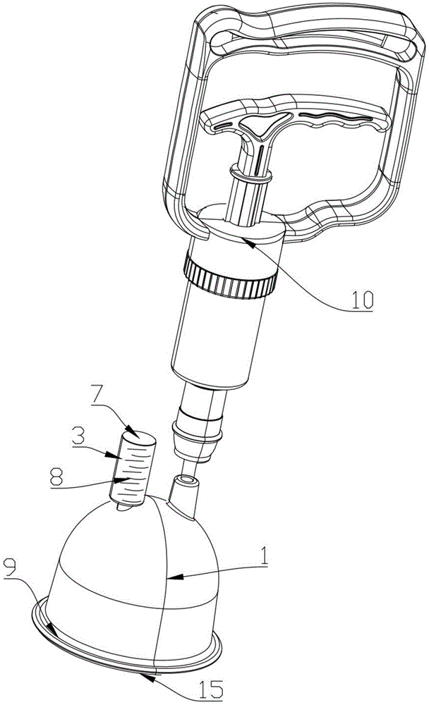 本技术方案通过贴合部9的设计,与人体接触部位相吻合,将拔罐作用于人体所患部位,尤其是像肩膀等部位,可以使拔罐与肩膀得到更好的结合,解决了在使用时经常漏气等问题,大大提高了治疗效果,促进机体的恢复,加快人体的康复,使用起来更加方便。