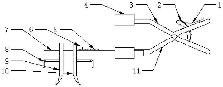 现在常用的口腔颌骨撑开器只能对上下进行撑开,不能够对左右进行撑开,而且在该手术中,要将下颌骨的中部切开,在切口处固定两条纱布,需要两个医护人员协助分别从左右两边拉扯纱布,