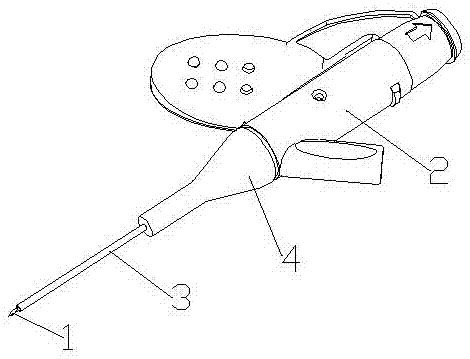 现有技术中的留置针,如图1所示,其导管座2与留置导管3之间通过金属铆钉铆5接定位。因金属铆钉的存在,在输液过程中,金属可能与部分药液进行化学反应,影响留置针正常使用的同时也影响输液的安全性,同时带金属铆钉的留置针无法适用于做核磁共振的病患,在临床的操作过程中钢针与金属的铆钉摩擦,有落屑的风险,此外,可能会出现重金属超标的问题,威胁输液患者的健康。