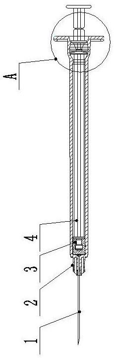 自毁式注射器是使用后防止重复使用的一次性注射器产品,在注射完毕后,依靠手工或机械力量,使芯杆不能从针筒内抽出,达到自锁,或是活塞的密封性能被破坏,或是注射器的推杆被推断,最终达到防止重复利用的目的。现有技术中,自毁式注射器的自毁结构有多种,但大多仍存在结构复杂或操作复杂,或结构虽然简单但自毁效果差(主要表现在用力回拉芯杆时自锁失效,容易出现芯杆从针筒内拉出而没有自毁的情况)。