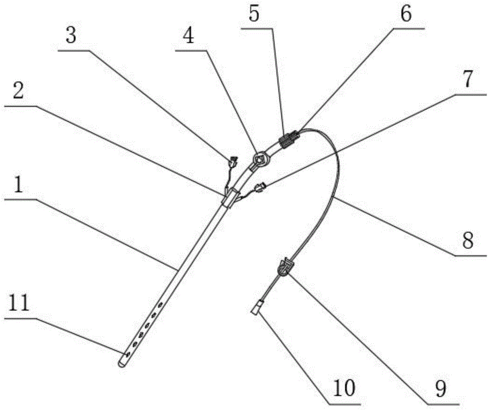 第一连接部5的上端可拆卸连接有第二连接部6,第二连接部6连通有连接管8,连接管8上设置有止液夹9,止液夹9的下端连通有连接头10,第二连接部6和第一连接部5直接为可拆卸连接,使得能够对在使用时和多种仪器连接,增加了适配性。